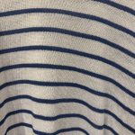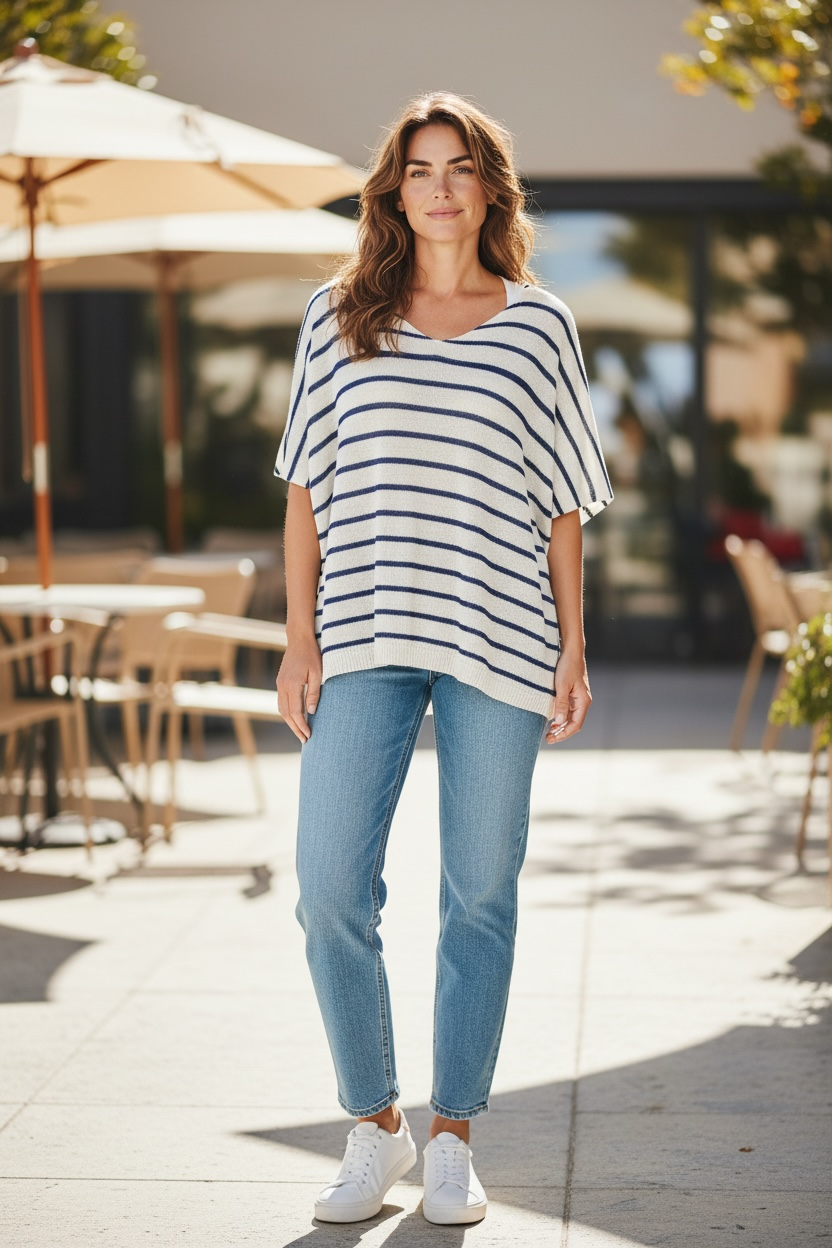 Loose fitting short sleeved knit with horizontal stripe. A relaxed boxy silhouette with wide neckline offering a casual look. A casual, comfortable top which works well for warm weather or layering with a soft, feminine colour palette.