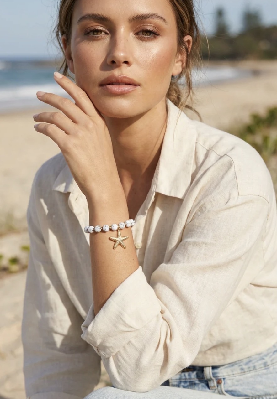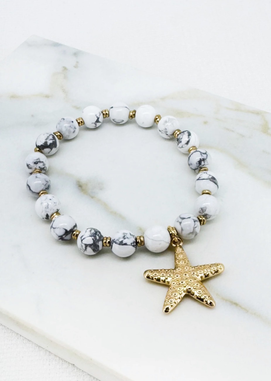 Envy White bead stretch bracelet with gold starfish charm