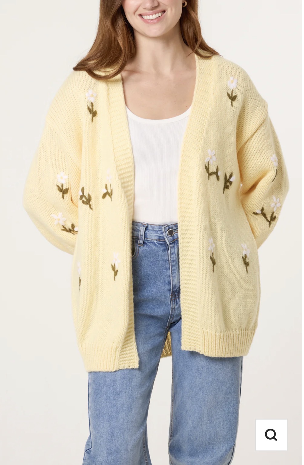 An oversized chunky and soft knitted open front long sleeved cardigan with coloured floral embroidery detail in a soft lemon colour