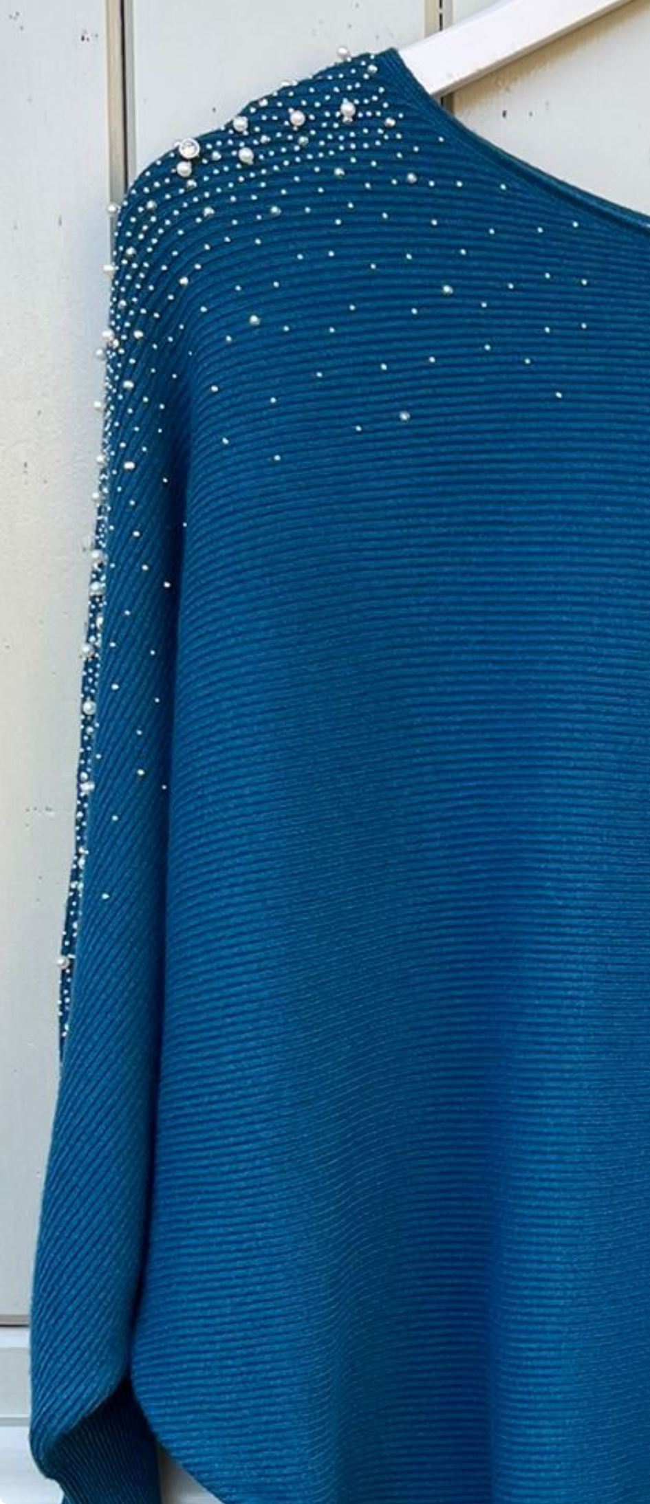 Sparkle & Pearl Sleeve Detail Jumper in Teal